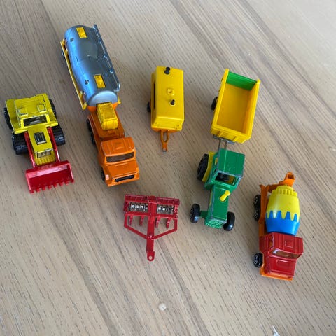 Legetøjsbiler entreprenørmaskiner og lastbiler sæt med forskellige arbejdskøretøjer. Sættet omfatter blandt andet kranbil, gravemaskine, dumpere, lastbiler med lad, specialtrailere og andre entreprenørmaskiner i miniatureudgave. Køretøjerne er i blandede farver, primært gul, orange, rød og grøn. Velegnet som samlesæt til leg med byggeplads- og transporttema eller som supplement til modelbane og lignende opstillinger. 20 dele ladtbiler