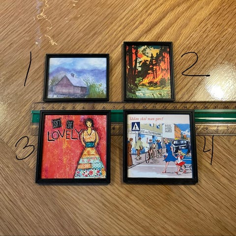 Lundby dukkehus tilbehør bestående af små udklipsark i miniaturestørrelse. Sælges pris 10 kr pr stk jeg sender køber betaler fragt blandt andet to små “påklædningsdukke”-ark med kvindefigurer og tøj samt et større ark med med cowboy og heste tryk og en med påklædningsdukker De små ark måler få centimeter i højden, som vist ved linealen på billederne, og er velegnede som tilbehør til Lundby dukkehuse eller andre dukkehuse i tilsvarende skala. Trykkene forestiller blandt andet personer, dyr og påklædningsdukker og er udført på tyndt pap/papir. Motiver Retro tryk