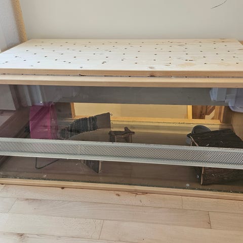 Hertil ca 50 ltr Über papirstrøelse (nok til et helt bur), gnavestang, 150 g tørrede melorme, 900 g Altromin 1234 rørfoder, ca 1 kg Versele-Lage fuldfoder (der er mad til ca 1 år), 6 hirsestænger og diverse rester af gnaveting samt solsikkekerner/tørrede grøntsager.
