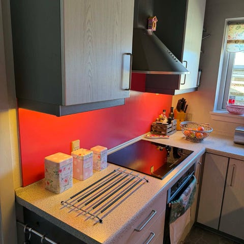 Køkken med skabe, bordplader og hvidevarer