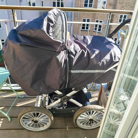Scandia barnevogn kan bruges til altanbarnevogn eller rulleture. Repareret med elastik ved fjeder ved højre hjul ved fodbremsen. Jordslået indvendig ved kalache, kan tages af og vaskes.