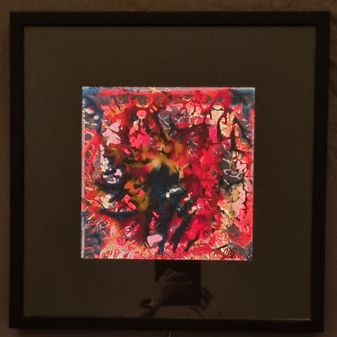 Abstrakt maleri med integreret lysfunktion, der skifter farve og fremhæver forskellige mønstre og detaljer i værket. Maleriet består af flere sektioner med levende farver som rød, blå, pink og grøn, der ændrer sig ved brug af lys. Velegnet til dekorativ brug i hjem eller kontor, hvor visuel effekt og stemningsbelysning ønskes.
