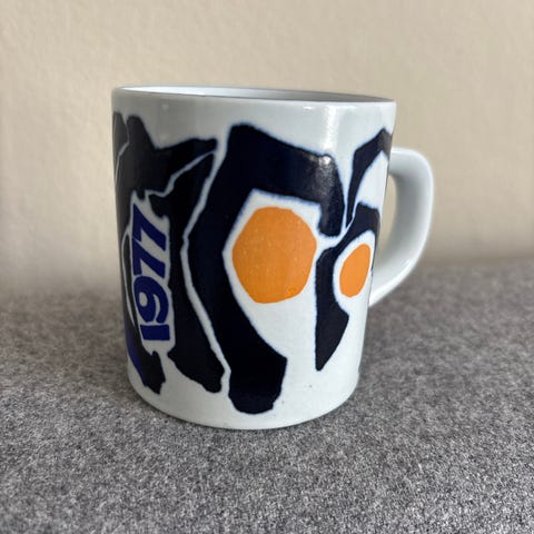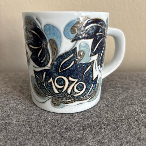 Royal Copenhagen 1988 krus 20 cl hvid med sort og orange mønster