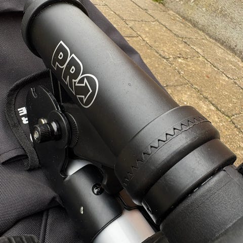 Cykelarbejdsstand med stativ i sort metal. Stativet har tre ben og en justerbar arm med blå kæber til fastspænding af cykelrammen. Der er en rød bakke til opbevaring af smådele og værktøj under arbejde. Egnet til reparation og vedligeholdelse af cykler derhjemme eller i værksted.