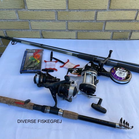 Sæt med flere fiskestænger og tilbehør. På billederne ses forskellige stænger i flere længder med kork- og skumhåndtag samt hjulholdere. Der medfølger fisketaske, etui til hjul, fiskehjul, agnæsker med diverse spinnere, blink og kroge. Sættet kan anvendes til forskellig form for lystfiskeri afhængigt af stænger og hjul, f.eks. til sø-, å- eller kystfiskeri. Et stk 9 for, 2 stk 7 fod. DAM hjul med hurtig udskiftelig spole og andet tysk hjul.