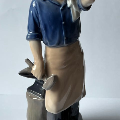 Porcelænsfigur af smed med ambolt. Figuren viser en stående smed med forklæde, hammer og hestesko ved siden af en ambolt på træblok. Udført i glaseret porcelæn i lyse og blå nuancer. Fabriksmærke ses under bunden.