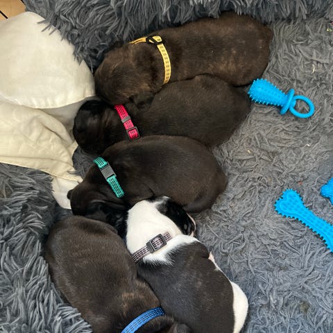 Molly har jeg haft siden hun var 12 uger, hun er stadig meget hvalpet, verdens dejligste kælepot og om aften/natten ligger hun helst gerne i ske med mig. Hun er vant til at være alene hjemme SAMMEN med min anden hund. Jeg er hjemmegående, så de er meget sammen med mig. Begge hunde gøer hvis det banker på døren indtil man har hilst på dem. Molly elsker min søn på 10 år. Hun er en meget glad hund og glad for legetøj og for at gå tur med pind i munden. Hun er tung bag i, så hun skal for det meste hjælpes med at bæres op i sengen, medmindre hun lige har godt med fart på 😅
