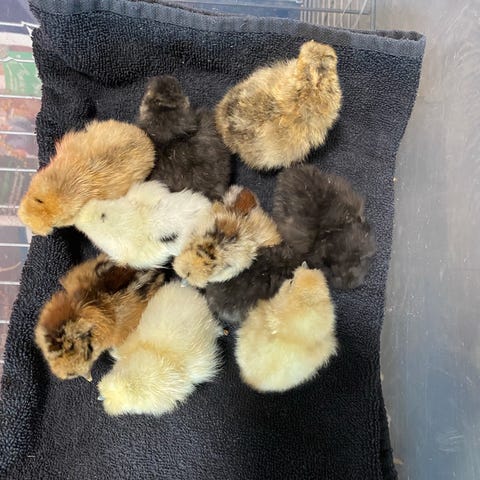 Silkehøns kyllinger i blandede farver, primært sorte og hvide. Kyllingerne er nyligt klækkede og går på strøelse i kasse. Egnede som hobbyhøns eller til avl af silkehøns. Farver og antal kan variere efter kuld.