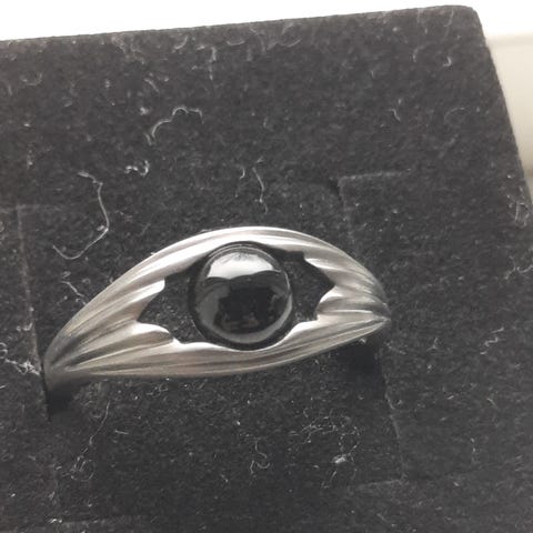 Smuk og feminin ring udført i mat oxyderet Sterlingsølv prydet med en smuk facetslebet blå/grå perle.