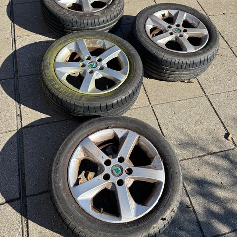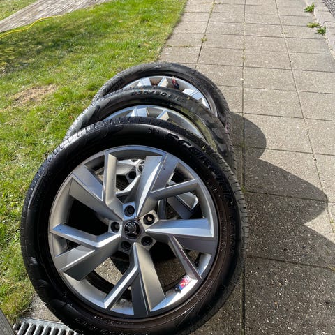 Sælger min skoda fælge som har siddet på en skoda kodiaq fra 2023. Dækkene er hankook mærke og der er ca. 5.5 mm på 3 af dækkene og ca. 7 mm på 1 dæk.