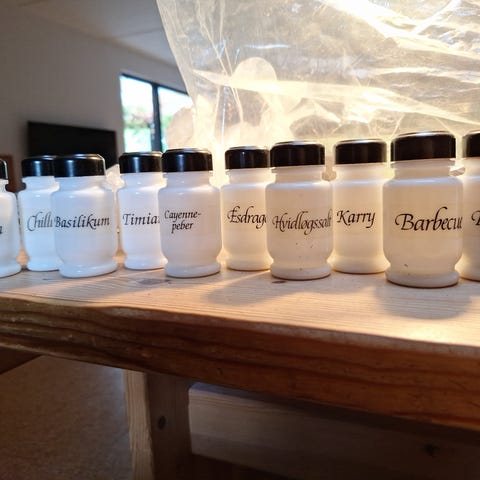 Glas, 4 FLOTTE RETRO APOTEKER KRYDDERI GLAS 8,5 CM STRØ, APOTEKER KRYDDERI GLAS, 4 FLOTTE APOTEKER KRYDDERI GLAS