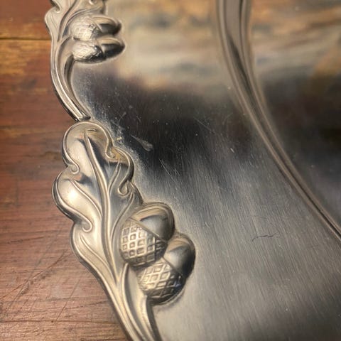 Rustfrit stål, Cabaret fad, rustfrit stål fad med, Rigtigt flot, dekorativt og velholdt cabaret fad med 3 rum i rustfrit stål mål 21x32,5 cm. Fadet har håndtag i begge ender i mørkt træ (måske teak træ).