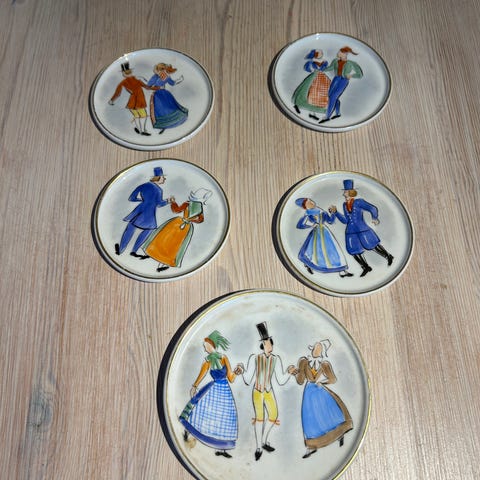 Sæt af 5 håndbemalet B&G platter med motiver af danske folkedansere i regionsdragter. 4 mindre (ca. 9 cm) + 1 større tallerken/underkop (ca. 13 cm). Mærket på bagsiden: Bing & Grøndahl, København, Danmark. Pæn stand med alderssvarende patina.