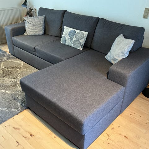 Ældre sovesofa med chaiselong. Kan vendes med chaiselongen i begge sider. Opbevaring under chaiselong.