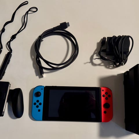 Nintendo Switch håndholdt konsol i blå og grå. Konsollen har indbygget skærm og faste knapper i siderne, herunder styrekors, analoge styrepinde og funktionsknapper. Velegnet til håndholdt spil på farten og hjemme. Understøtter spil til Nintendo Switch-platformen. Farvekombination med blå frontdetaljer og grå ydre skal.
