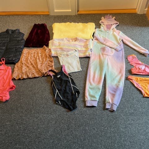 Pakken indeholder blandet pigetøj, herunder overdele, underdele og eventuelt kjoler i forskellige farver og mønstre. Velegnet til pige med tøjstørrelse 10-14 år, som ønsker en varieret garderobe med flere forskellige styles fra i samme størrelse.