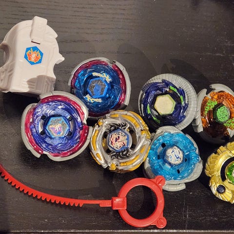 Beyblade sæt med arena og flere tops. Sættet indeholder en lille blå kamp-arena, flere Beyblade-tops samt tilbehør som affyrere og nøgler. Egnet til bord- eller gulvleg, hvor flere spillere kan konkurrere mod hinanden. Velegnet til børn fra ca. 8 år og opefter, afhængigt af producentens anbefalinger på æskerne.