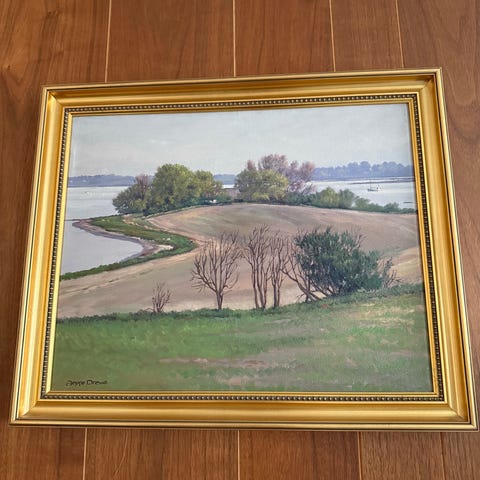 Smukt lyst maleri med guldramme, malet af landskabsmaler Svend Drews.