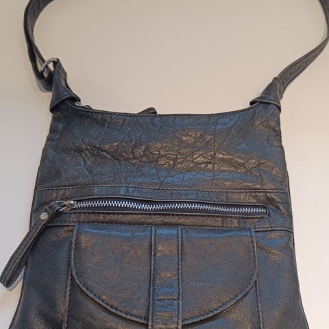 Sort skuldertaske til kvinde i kunstlæder. Tasken har lange hanke til bæring over skulderen og et rummeligt hovedrum. Indvendigt er der lyst foer med flere rum og en lynlåslomme til mindre genstande. Lukningen er med trykknapper/metaløjer øverst. Velegnet som hverdagstaske med plads til pung, telefon og andre personlige ting.