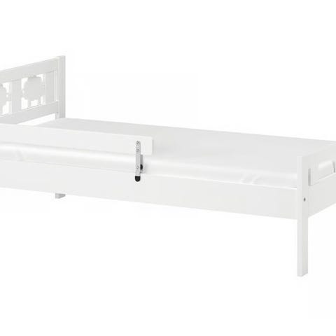IKEA BUSUNGE juniorseng i hvid. Juniorsengen har høje gavle ved hoved- og fodende samt sider, der giver afskærmning. Sengen er egnet til mindre børn, som er vokset ud af tremmesengen. Klassisk, neutral farve, der passer ind på de fleste børneværelser. Inkl madrassen.