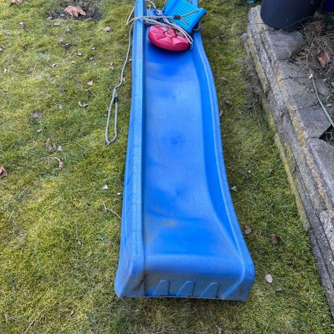 Grøn rutsjebane i plast egnet til montering på legeplads eller legetårn. Rutsjebanen er udformet i ét langt stykke med let bølget form og høje kanter i siderne for at hjælpe med at holde barnet på banen. Materialet er hård plast, som er velegnet til udendørs brug. Passer typisk til montering på en mindre privat legeplads eller i haven, hvor der ønskes en separat rutsjebane til børn.