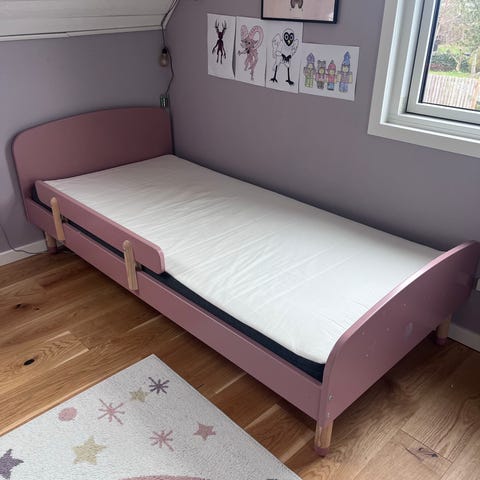 Børnseng med skuffe i lyserød. Sengen har lamelbund og en stor udtræksskuffe under liggefladen, som kan bruges til opbevaring. Egnet til mindre børn, der er vokset ud af tremmeseng og skal over i en juniorseng. Farvekombination af lyserød og hvid, med trælameller i bunden. Velegnet til børneværelse med behov for ekstra opbevaringsplads under sengen den kommer ryger fra hus