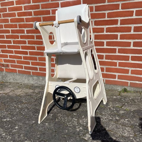 Stokke højstol til bordmontering. Højstolen er udstyret med polstret sæde og ryglæn med mønstret betræk samt sikkerhedssele foran. Stolen fastgøres direkte på bordkanten med metalbeslag og justerbare arme. Velegnet som spiseplads til mindre børn ved almindeligt bord. Betrækket kan tages af for rengøring afhængigt af model og udførelse.
