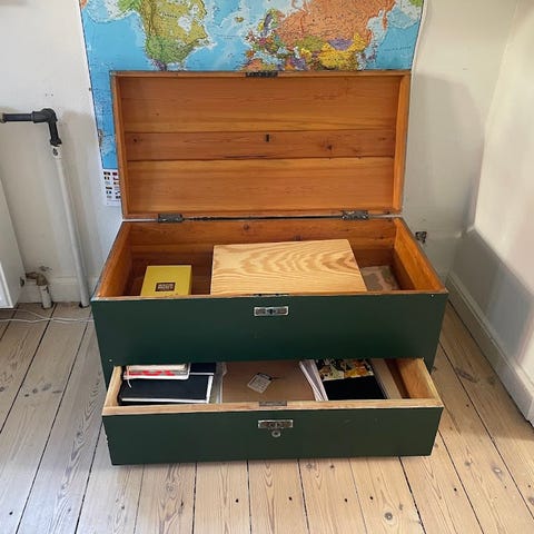 Grå kiste. Har nogle ridser på låget, som jeg har prøvet at tage et billede af.