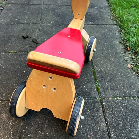 BRIO løbecykel i gul og hvid. Trækøretøj med fire hjul og sort sæde. Styret er udformet som et håndtag, der giver barnet mulighed for at holde godt fast under kørsel. Egnet som balance- og motoriklegetøj til mindre børn, der øver sig i at gå og køre selv. Designet til indendørs brug på jævne underlag.