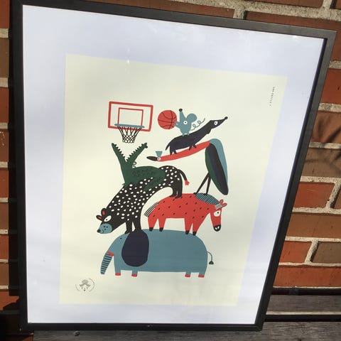 Charmerende plakat med et dansk børnealfabet illustreret af Helen Dardik for Mimi's Circus. Den kombinerer bogstaver med sjove tegninger, der passer til de danske ord. I hvid ramme.