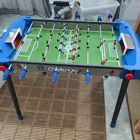 Brio bordfodbold flipperspil i træ med grøn spilleplade udformet som en fodboldbane. Spillet har faste træpinde på banen, fire hjørnefelter med fodboldmotiv og flipperknapper i siderne til at styre spillet. Der medfølger metalkugler som bolde. Velegnet som bordspil for børn og familier.
