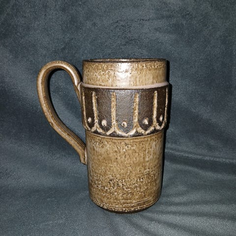 Mona Keramikkrus med håndmalet blomstermotiv i gule og grønne nuancer. Kruset har konisk form med hank og en gul kant nederst og langs hankens overside. h 11cm dia 8/6cm