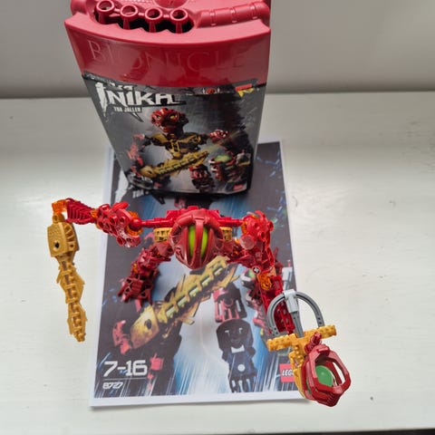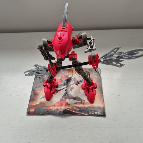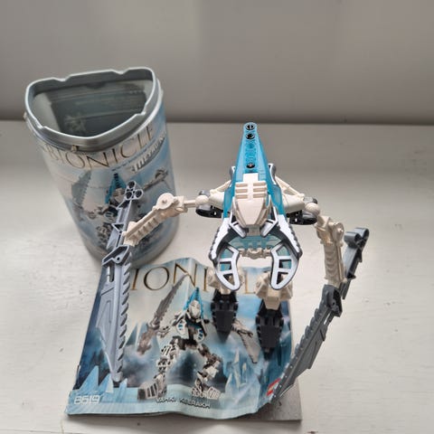 Lego Bionicle figur i grønne og grå nuancer. Figuren består af sammensatte plastdele og er udstyret med to våben. Der medfølger en trykt byggevejledning, som ses på billederne. Velegnet som samlesæt eller til leg og udstilling sammen med andre Bionicle dele.