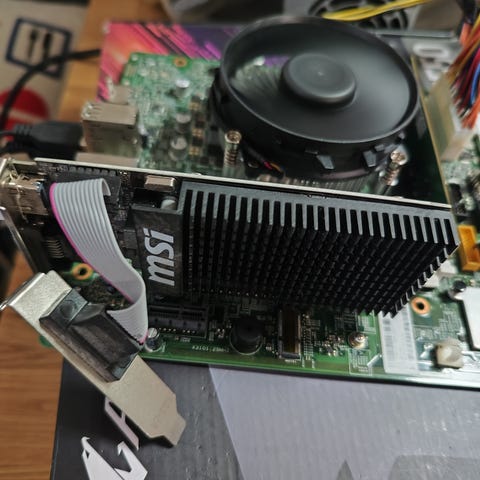 MSI PRO H610M-E bundkort, Intel Core i3 12. generations processor, TeamGroup T-Force Vulcan Z DDR4 RAM-moduler samt separat grafikkort. Bundkortet er et MSI PRO H610M-E med DDR4-understøttelse til Intel 12. generations Core-processorer. Processoren er en Intel Core i3 fra 12. generation, egnet til almindelige desktopopgaver. RAM er TeamGroup T-Force Vulcan Z DDR4, vist som to moduler i standard desktop DIMM-format. Grafikkortet er et kompakt kort i fuld højde med enkelt blæser og PCIe-tilslutning. Sættet kan anvendes som grundlag for en stationær pc til kontorbrug, studier eller let multimediebrug, afhængigt af de præcise specifikationer på de enkelte komponenter.