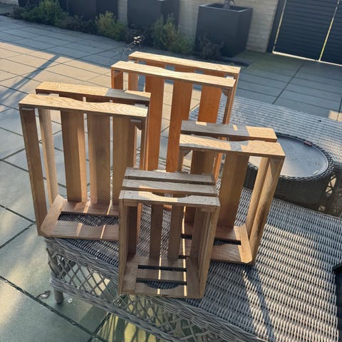 Trækasse i grønlig farve med slidt overflade. Kassen har udskårne greb i siderne og består af brædder med synlige samlinger. Velegnet til opbevaring eller som dekorativ indretningsdetalje. Mål og præcise materialetyper er ikke oplyst.