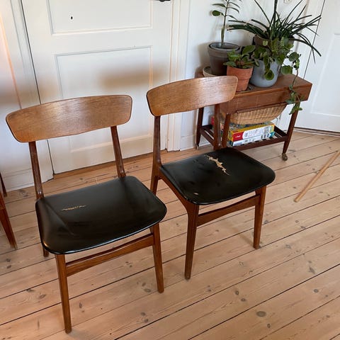 Jeg sælger mine teaktræsstole i erkendelse af jeg aldrig får skiftet betrækket. Den ene stol vil formentlig skulle have skiftet både skum og læder mens den anden ligner den kan nøjes med bare læderet. Jeg har to lignende teaktræsstole til salg også i en lidt anden form men også fra 60’erne. Prisen er samlet for begge.