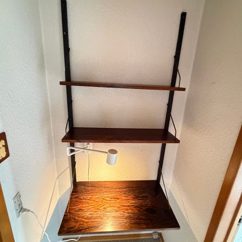 Flot vægreol med lækre detaljer i egetræ. Flot håndværk og god tyngde. Den er solid og vejer godt til. Mål 50x50x16 cm og er i meget flot stand. Se detaljebillederne. For tung til at snede. Afhentning i Fredericia 375 kr