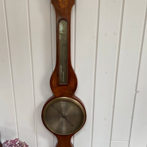 Barometer vægmodel i grønmalet træ. Instrumentet er udformet som en lang, smal vægmodel med skala for sommer og vinter samt trykangivelser på dansk. Egnet til ophængning indendørs som vejrinstrument og dekorativt indslag i indretningen.