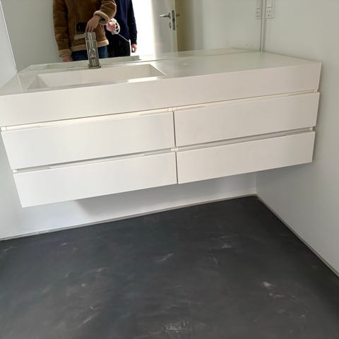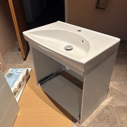 Badeværelsesmøbel der er brugt i gæstetoilet, så ikke meget slidt. Vasken er i kunststof. Underskabet har 2 skuffe til opbevaring. Bredde ca. 80 cm ifølge måling på billederne. Det er også muligt at skifte vask/benytte skab til anden IKEA vask