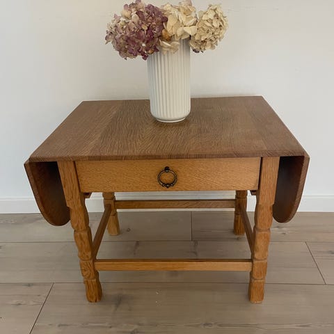 Sengebord væg ophæng, i massiv egetræ. Fået mørk olie som røget egetræ. Lavet rille til ledninger