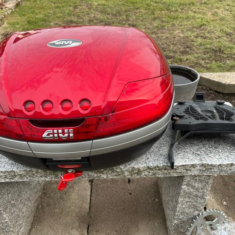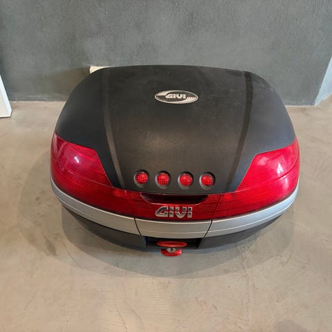 Givi topboks i hård plast i sort med rød refleks. Topboksen leveres med tilhørende monteringsplade og bagagebærer/beslag til montering på motorcykel eller scooter. Boksen har lås på fronten og integrerede reflekser bagtil. Egnet til opbevaring af hjelm og andet udstyr under kørsel og parkering.