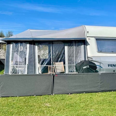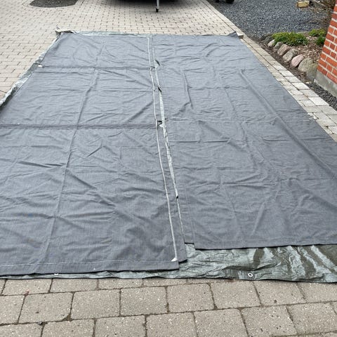 Læsejl i gråt stof. Består af flere sammenhængende paneler, der kan opstilles i vinkel. Monteres på stolper med beslag i toppen. Velegnet som afskærmning i have, på terrasse eller strand for at skabe læ og afskærmning. Materiale og præcise mål er ikke oplyst.