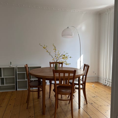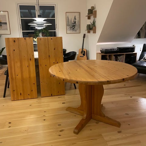 Rundt fyrretræsbord med udtræk og to ekstra plader