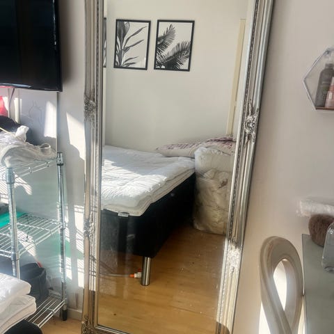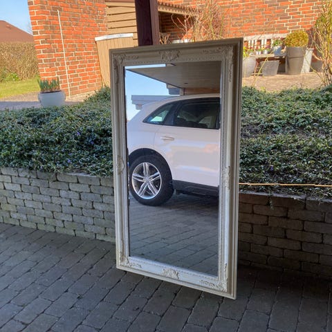 200x98cm. Facetslebet. Stort spejl/Butiksspejl. Kræver en klat maling og gips for at blive helt fin. Ukendt fabrikat. Glas i fin stand.