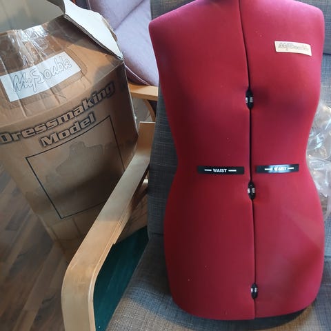 Justerbar skrædderbuste på træfod. Busten har polstret overdel med lys stofbeklædning og drejet træstativ med tre ben men det ene er lidt ustabilt . Egnet til syning, tilretning og udstilling af tøj i hjemmet, systuen eller butikken.