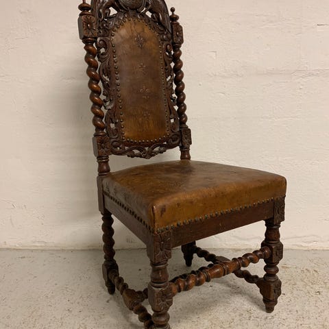Udskåret tronstol, 150 år gl., b: 56 d: 56 h: 104, Meget flot udskåret stol fra 1800 tallet. Flotte udskæringer. Fletværk i ryggen skal udskiftes.