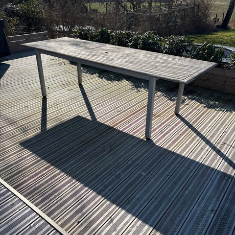Ovalt Mandalay havebord i hårdt teaktræ. Bordet har lamelopbygget bordplade. 71 cm højt. 100 cm bredt og 150 langt. Egnet til udendørs brug i have eller på terrasse. Træet fremstår patineret efter udendørs brug. Leveres i København og Nordsjælland