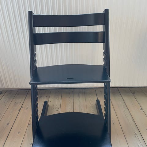 Stokke Tripp Trapp højstol i sort træ. Justerbar siddeplade og fodplade, som kan tilpasses barnets højde. God til brug ved spisebord eller andre borde, hvor dit barn skal sidde i samme højde som voksne.