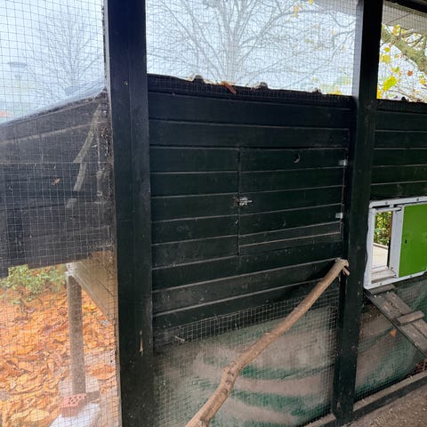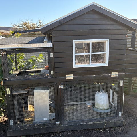 Hønsehus og hønsegård i træ med sortmalede brædder og volierenet. Huset har overdækket område og indgangshul til hønsene. Gården er indhegnet med trådhegn og træstolper, egnet til udendørs hold af høns eller mindre fjerkræ. Konstruktionen giver både læ og beskyttet udeareal til dyrene.