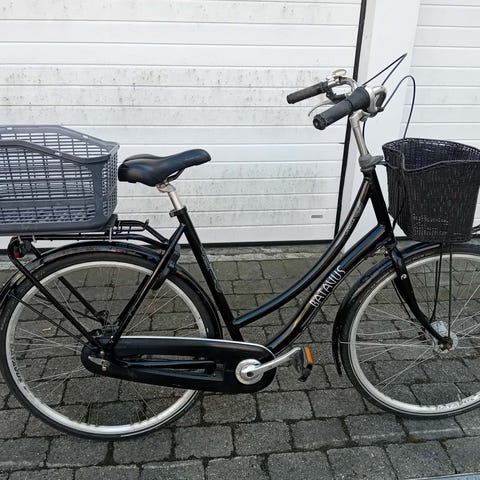 Batavus bycykel til kvinder med 53 cm stel og 28" hjul. Cyklen har lav indstigning og er udstyret med fastmonteret stor flot forkurv, bagagebærer, solid støtteben og kædeskærm.